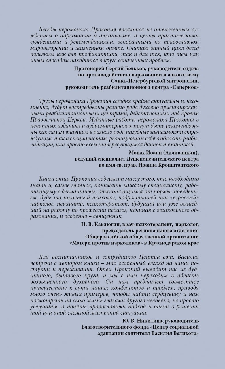 Настоящее издание под общим названием «Преодоление зависимого поведения: зависимым и их близким (родственникам, педагогам)» объединило беседы и лекции иеромонаха Спасо-Преображенского Соловецкого ставропигиального мужского монастыря Прокопия (Пащенко) о зависимом поведении и способах выхода из него.